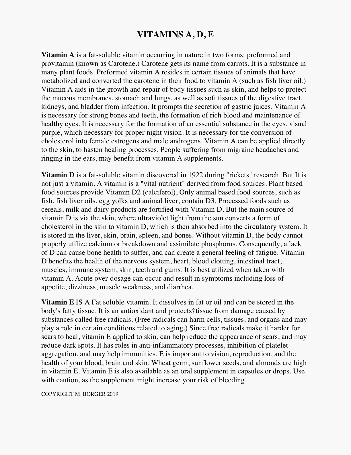 Vitamins A, D & E Vitamin A is a fat-soluble vitamin occurring in nature in two forms: preformed and provitamin (known as Carotene.) Carotene gets its name from carrots. It is a substance in many plant foods. Preformed vitamin A resides in certain tissues of animals... read more |