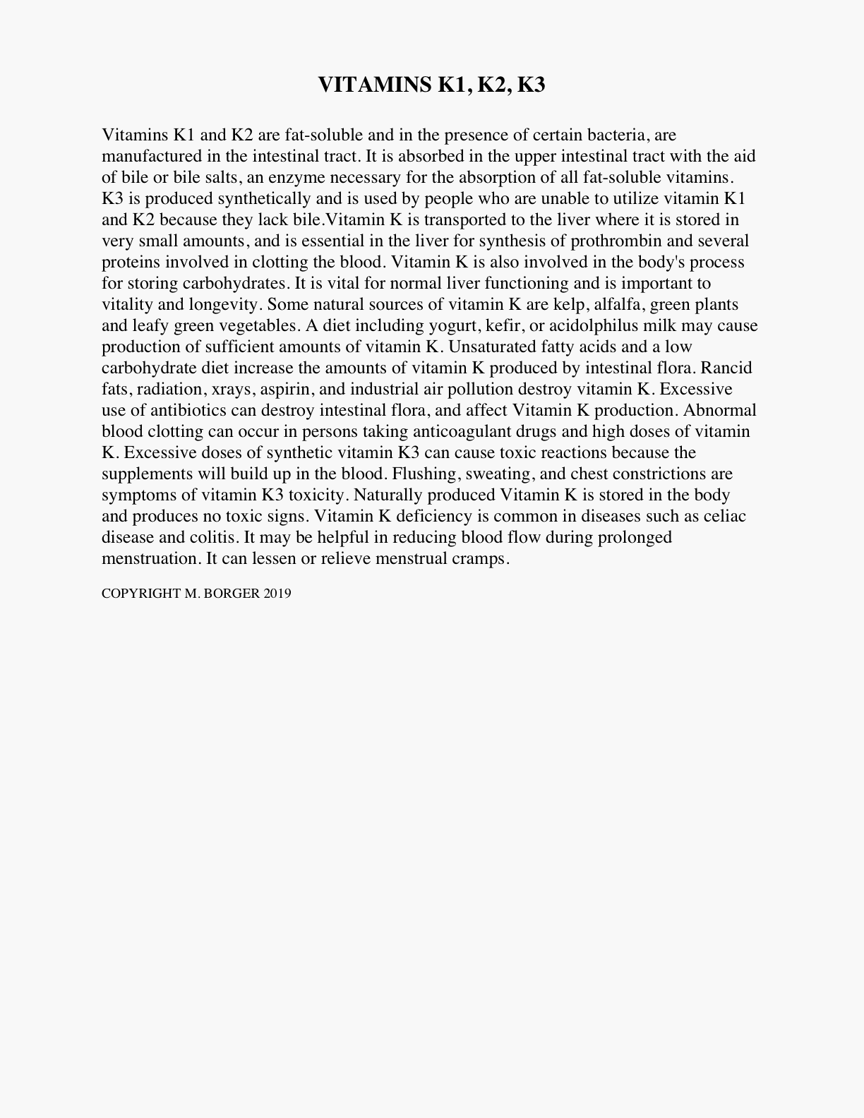 Vitamin K There are three K vitamins: K1, K2, K3. K1 and K2 are fat-soluble and in the presence of certain bacteria, are manufactured in the intestinal tract. It is absorbed in the upper intestinal tract with the aid of bile or bile salts, an enzyme necessary for the absorption... read more |